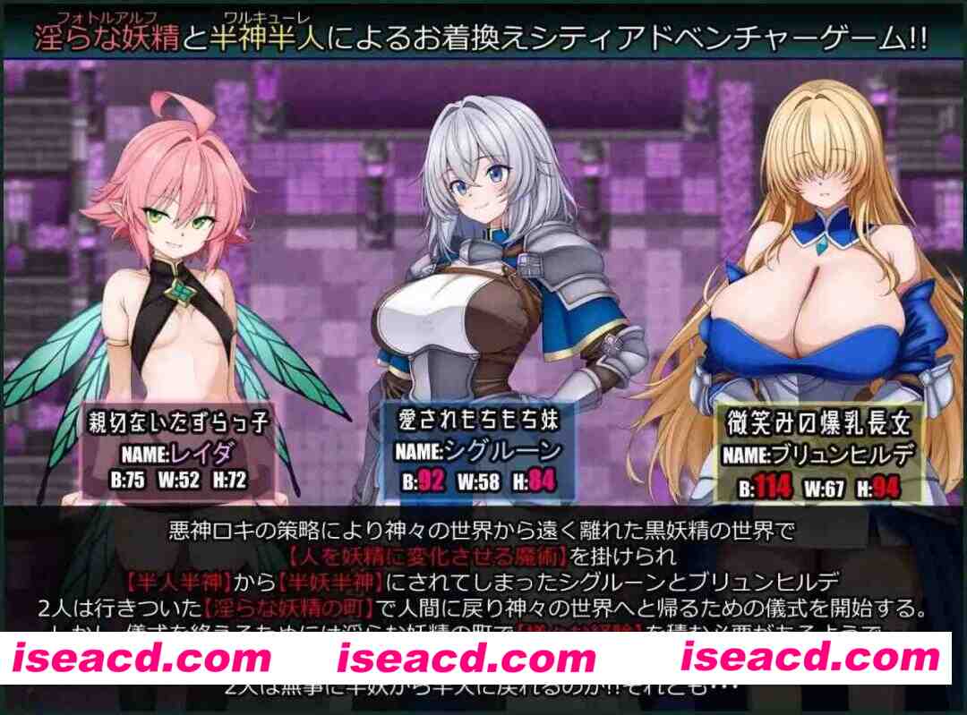 奥丁的臣下——战乙女西格露恩与布伦希尔德。在与英灵们训练之时,恶神洛基突然出现在她们面前。洛基为了实现自己的目标『神明妖精化』,将第一阶段定为利用『半神半人』的战乙女们,以压倒性的力量制服她们,并将她们带往某处。洛基将两人带到了远离神界、位于黑妖精世界边境之地,在那里对半神半人的战乙女二人施展了『淫靡妖精之城』流传的魔术——「将人类妖精化的魔术」。两位战乙女虽然抵抗着妖精化的魔术,但由于魔术中同时嵌入了拥有扭曲世界之力的『原初混沌』之力,妖精化魔术最终还是成功了。两人的身体被改造成了『半人类半淫靡妖精』,正当洛基的魔爪进一步伸向她们时,奥丁的使魔出现,击退了洛基并救出了两人。然而,半神半妖这种扭曲的存在无权返回神界,两人被迫必须靠自己的力量『恢复半神半人之身』。为了达成目的,她们前往附近的『淫靡妖精之城』,以使用在那里得知的「将妖精恢复人类的魔术」为目标,开始收集施展魔术所需的『7个魔术结晶』。然而,她们发现要获得魔术结晶,必须在『淫靡妖精之城』中经历各种『体验并产生强烈的情感』。究竟,原战乙女的两人能否在这『性欲之城』的体验中不迷失自我,成功施展魔术重返『战乙女』之位……还是会被混沌吞噬,彻底堕落为『淫靡妖精』……