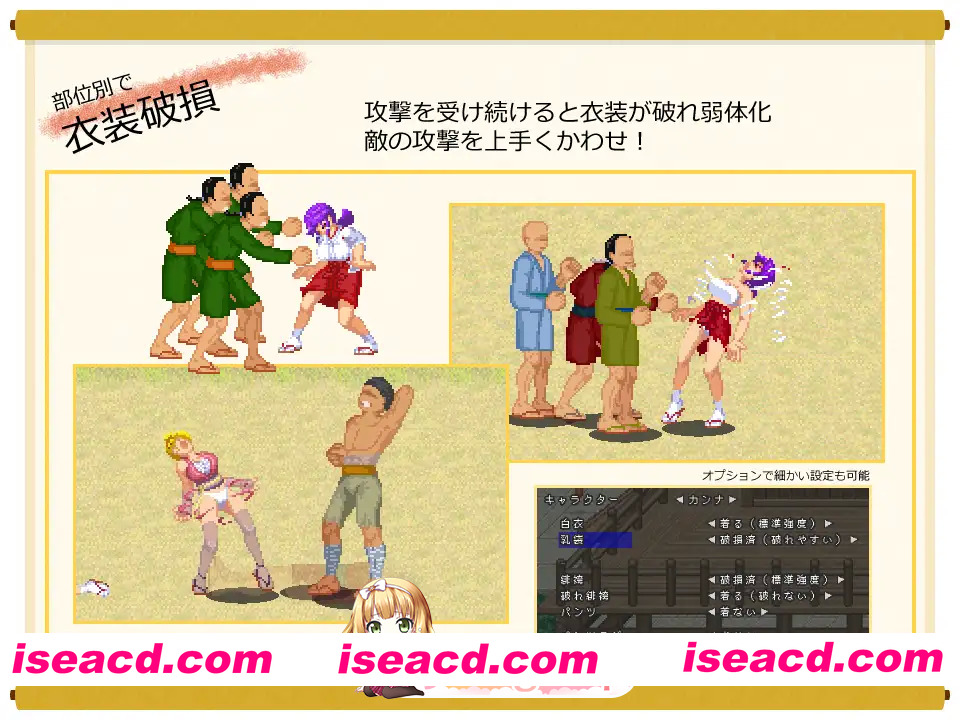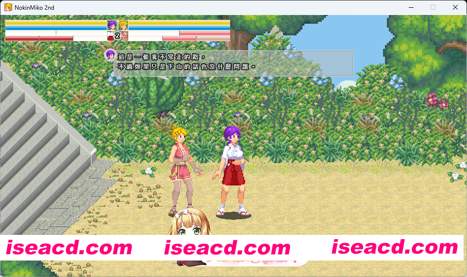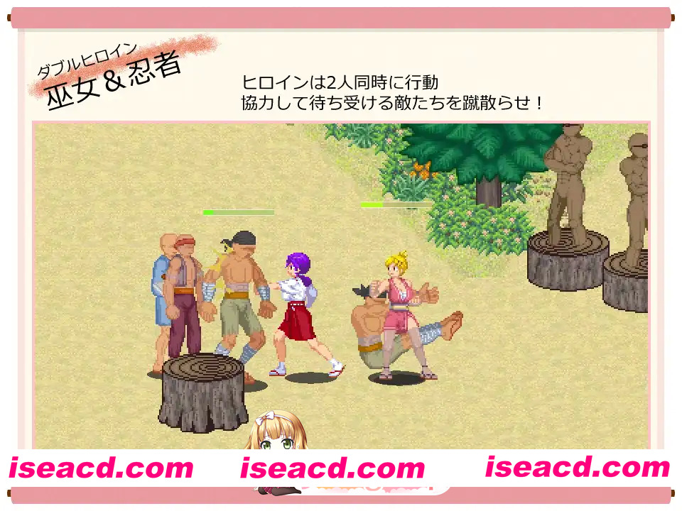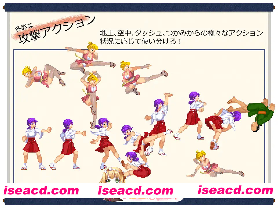 这是一款由巫女Kanna和忍者AoI两人一起前进的横版卷轴动作游戏。
